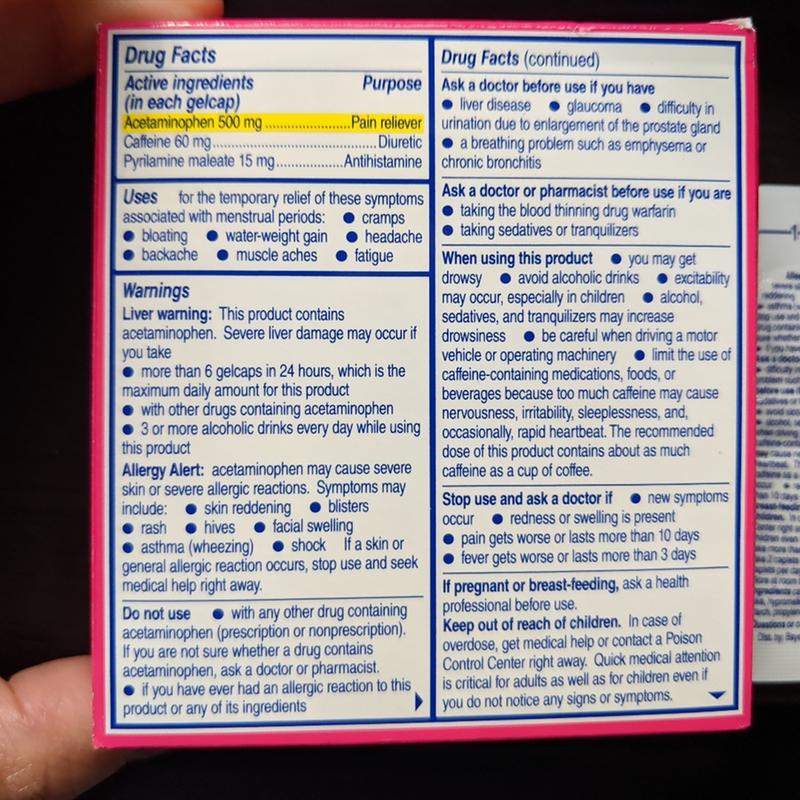 Get Period Symptom Relief Today. Acetaminophen 500 mg Caffeine 60 mg Pyrilamine maleate 15 mg. These medicines all are used safely by men.